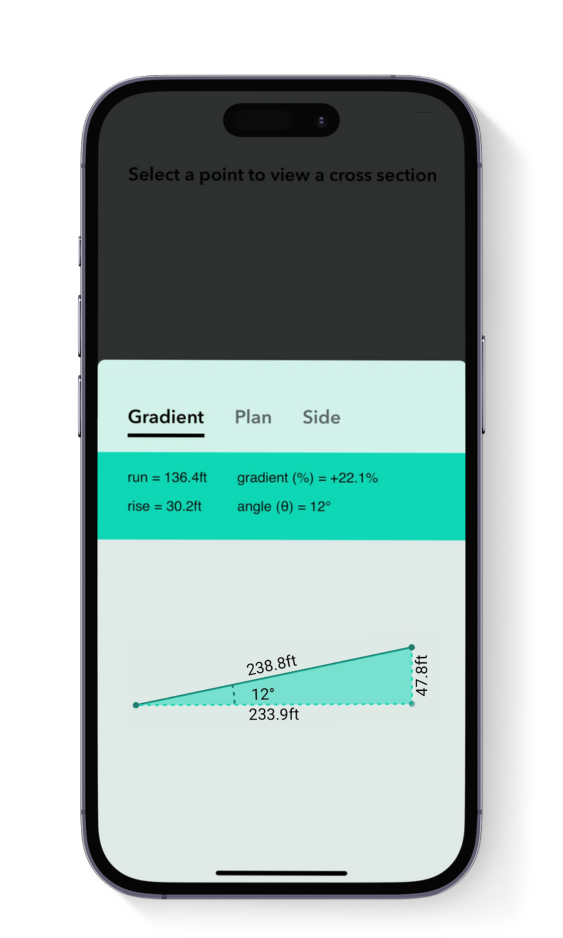 Using the cross section view, you can calculate the gradient, angle, and rise and run between 2 points.